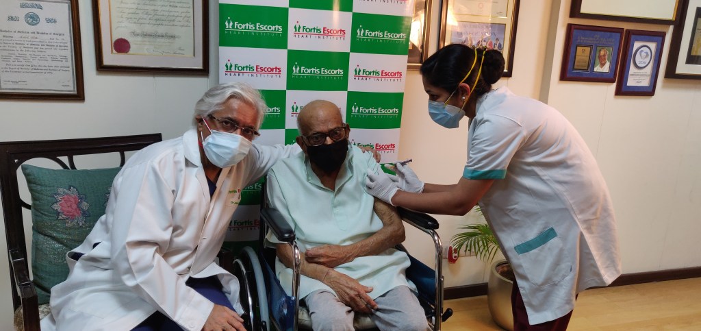 New Delhi, March 15, 2021: Kewal Krishan, age 107 years plus, became the oldest person in India to be vaccinated against COVID under the supervision of his cardiologist Dr Ashok Seth, Chairman, Fortis Escorts Heart Institute. Two years ago, he was the oldest patient in the world to have undergone stenting to the artery of left side of brain by Dr Ashok Seth to prevent a major brain stroke.