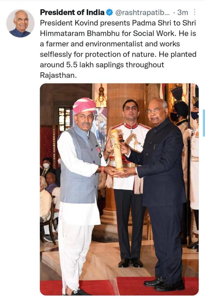Nagaur farmer Himmata Ram Bhambhu a.k.a. ‘Registan ke Ratna Ram’ was felicitated with Padma Shri for his enviable contribution to the environment. He adores and reveres trees and has so far planted five and a half lakh saplings in desert areas of Rajasthan, using ingenious ways to water and see them grow into green giants.
