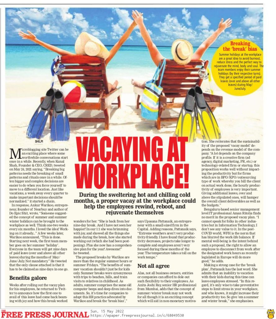 Give ’em a ‘summer break’ May 15, 2022The Free Press JournalAman Ritolia, Anita Joshi, Ankur Warikoo, Kunal Shah, new holiday norms, summer blues, summer hours, summer vacation, Upasanaa Pattanayak, workplaceShillpi A Singh The article was published in The Free Press Journal on May 15, 2022. https://www.freepressjournal.in/weekend/vacaying-at-workplace Share this: Click to share on X (Opens in new window) X Click to share on Facebook (Opens in new window) Facebook More Click to share on WhatsApp (Opens in new window) WhatsApp Click to print (Opens in new window) Print Click to email a link to a friend (Opens in new window) Email Click to share on LinkedIn (Opens in new window) LinkedIn Click to share on Telegram (Opens in new window) Telegram Click to share on X (Opens in new window) X Like Loading... Related