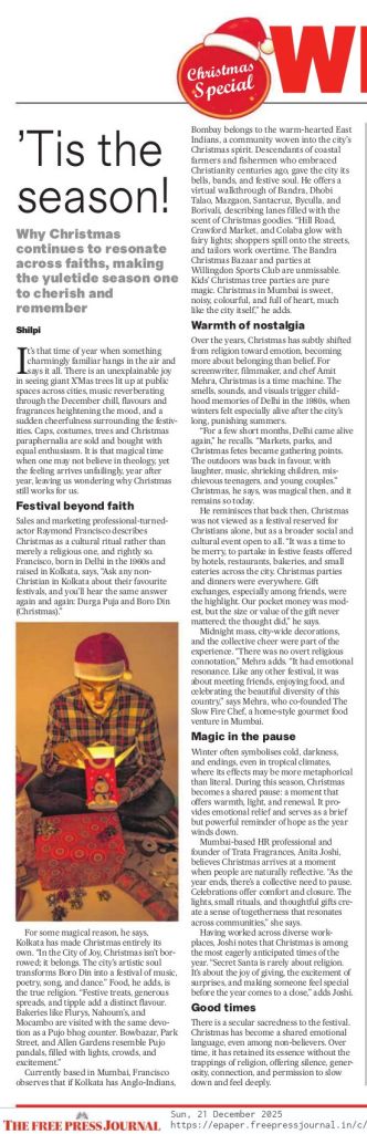 The article was published in The Free Press Journal, Mumbai, on December 21, 2025. https://www.freepressjournal.in/weekend/why-christmas-still-feels-magical-even-for-non-believers