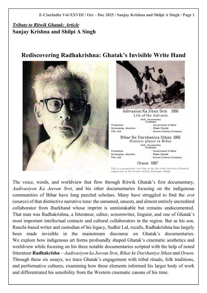 Rediscovering Radhakrishna: Ritwik Ghatak’s Invisible Write Hand in Jharkhand