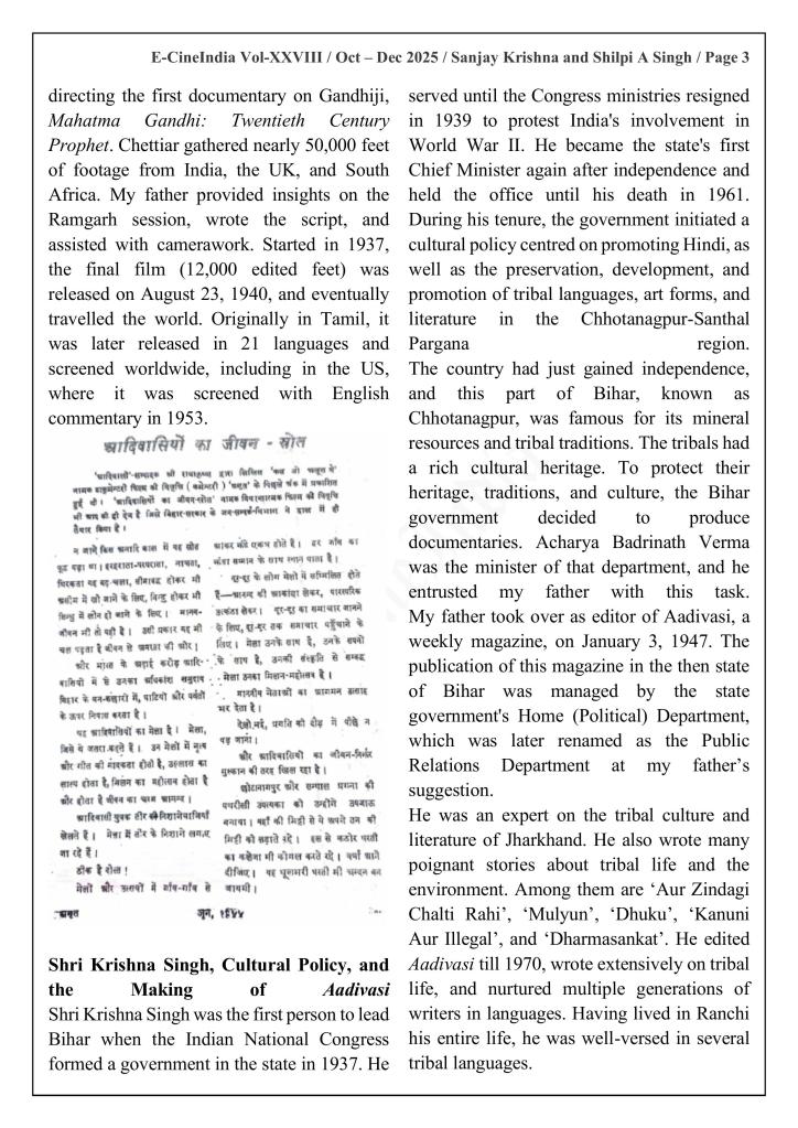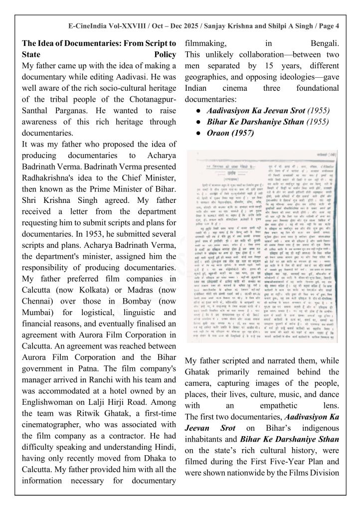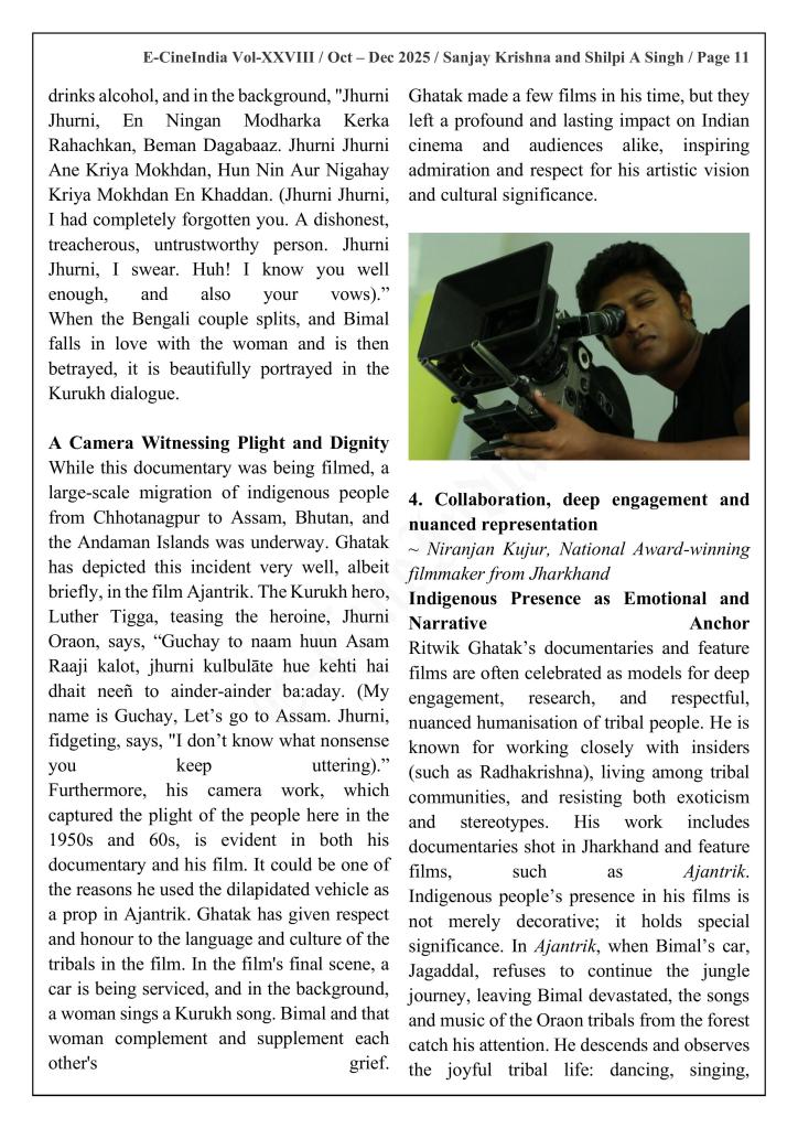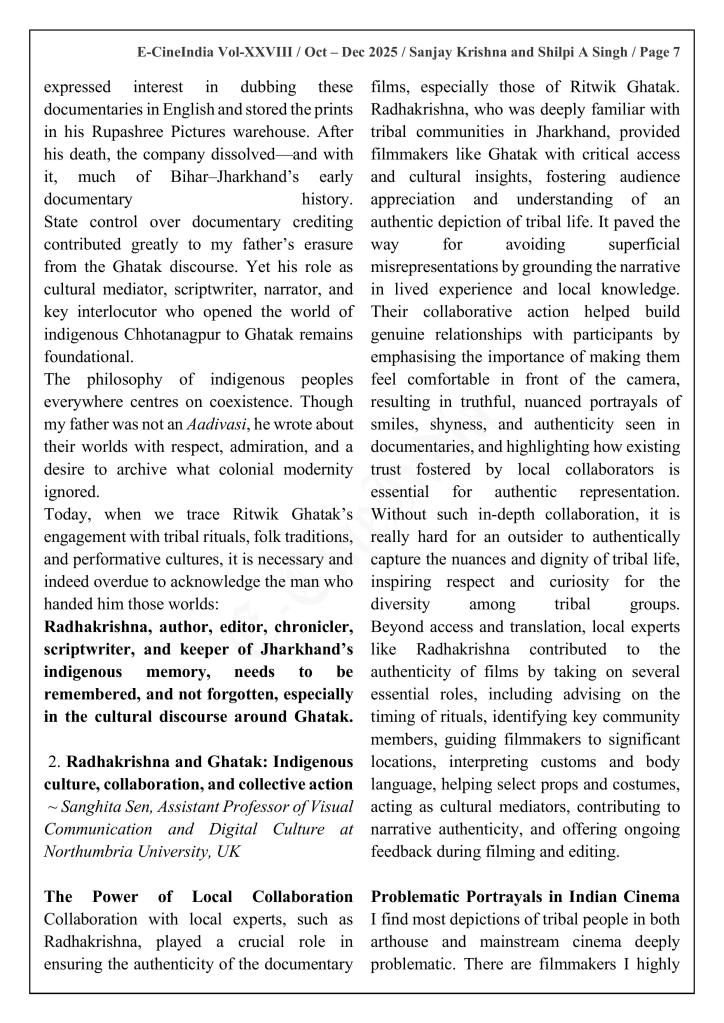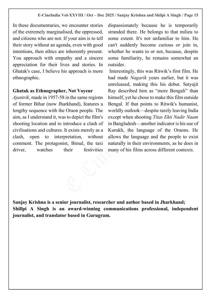“The voice, words, and worldview that flow through Ghatak’s first documentary, Aadivasiyon Ka Jeevan Srot, and his other documentaries focusing on the indigenous communities of Bihar have long puzzled scholars. Many have struggled to find the strot (source) of that distinctive narrative tone: the unnamed, unseen, and almost entirely uncredited collaborator from Jharkhand whose imprint is unmistakable but remains undocumented.