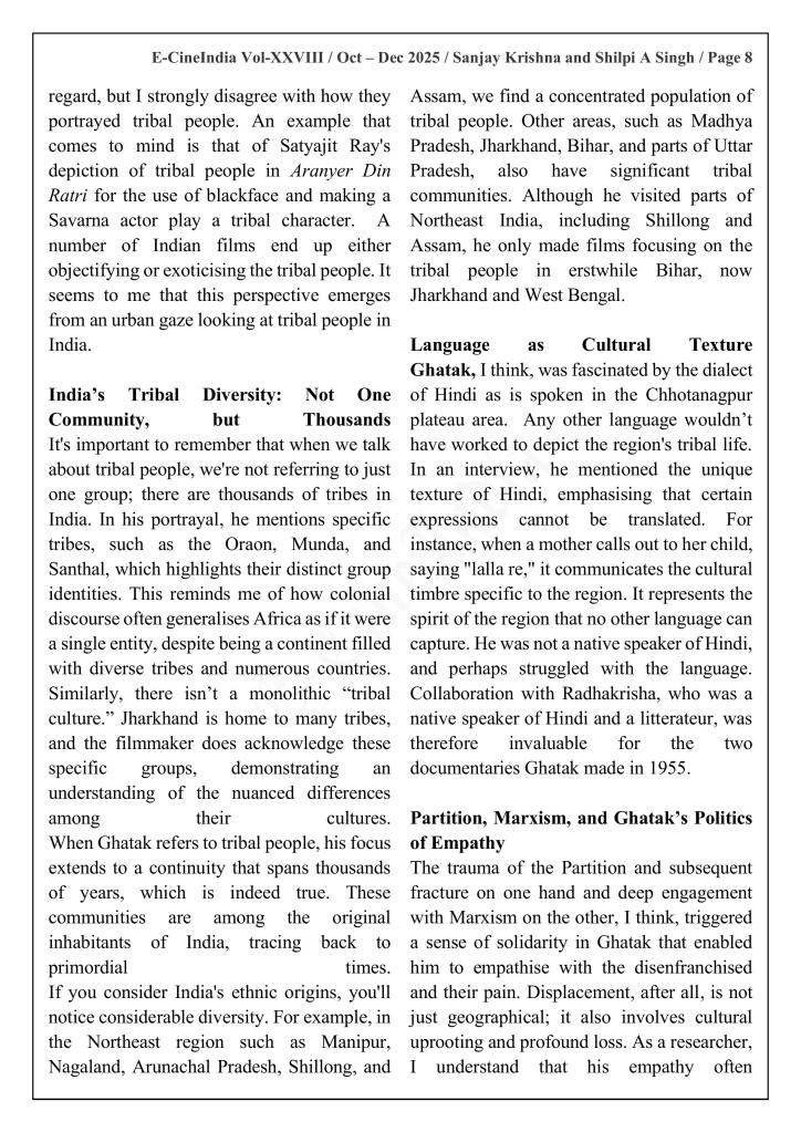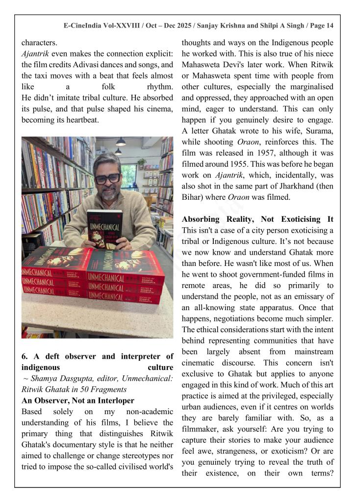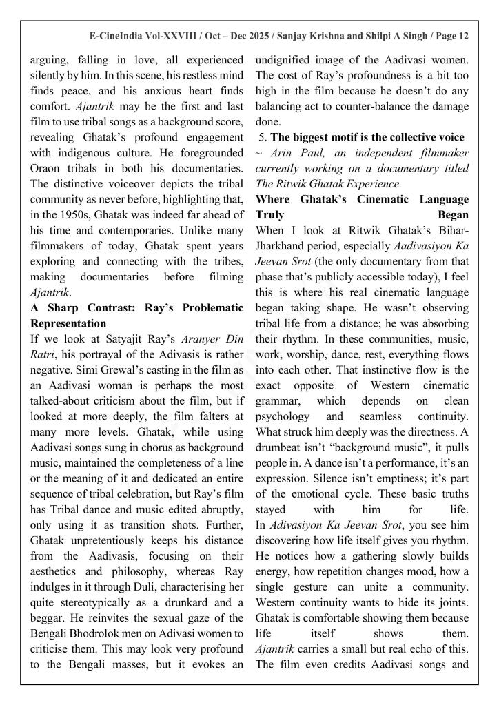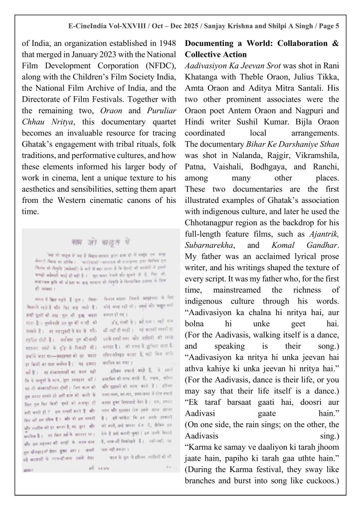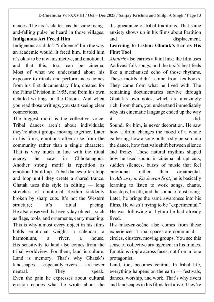 We explore how indigenous art forms profoundly shaped Ghatak’s cinematic aesthetics and worldview while focusing on his three notable documentaries scripted with the help of noted litterateur Radhakrishan—Aadivasiyon ka Jeevan Srot, Bihar ke Darshaniye Sthan and Oraon. Through these six essays, we trace Ghatak’s engagement with tribal rituals, folk traditions, and performative cultures, examining how these elements informed his larger body of work and differentiated his sensibility from the Western cinematic canons of his time. “