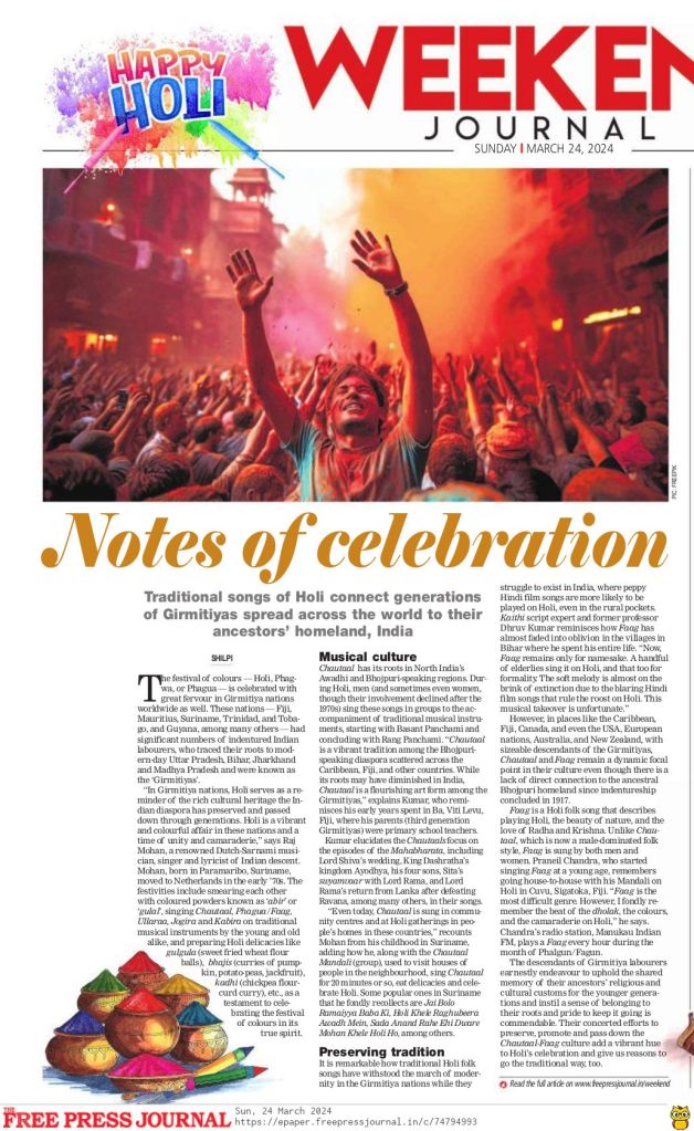 The article, covering the musical tradition prevalent among the descendants of the Girmitiyas, was published in The Free Press Journal, Mumbai, on the eve of Holi. https://www.freepressjournal.in/lifestyle/holi-2024-how-traditional-songs-bridge-generations-across-the-globe